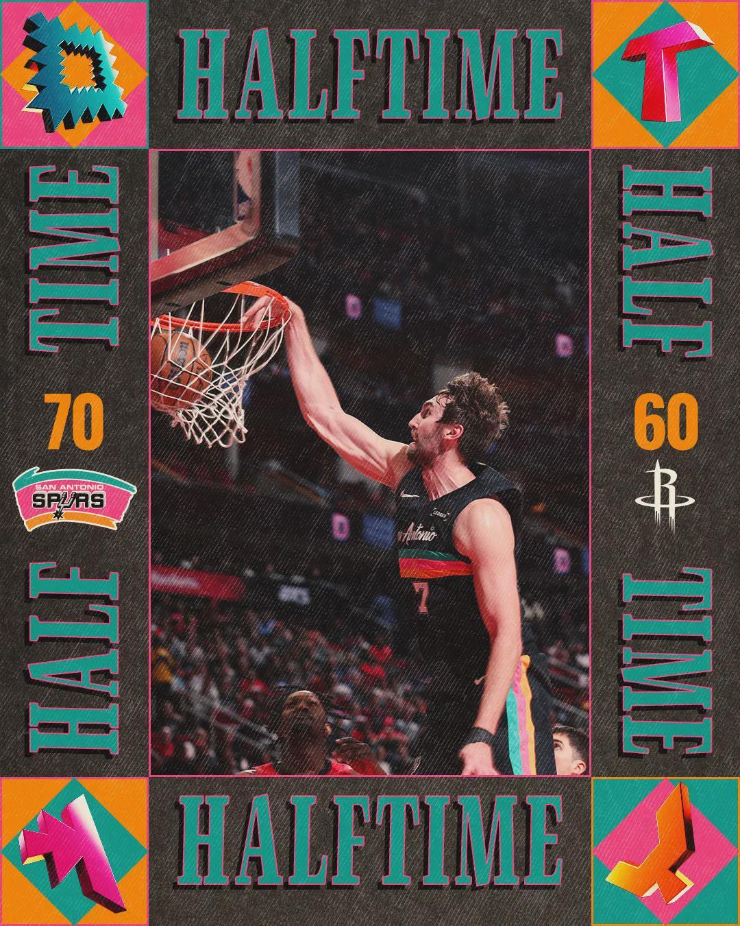 马刺两个新秀迪伦-哈珀和卡特-布莱恩特防守都不错,但外线投射太差了,基本上都被火箭放空。哈珀本赛季三分命中率24.7%,卡布三分命中率23.8%。马刺则是放空阿门-汤普森,阿门本赛季三分命中率只有可怜的19.1%。